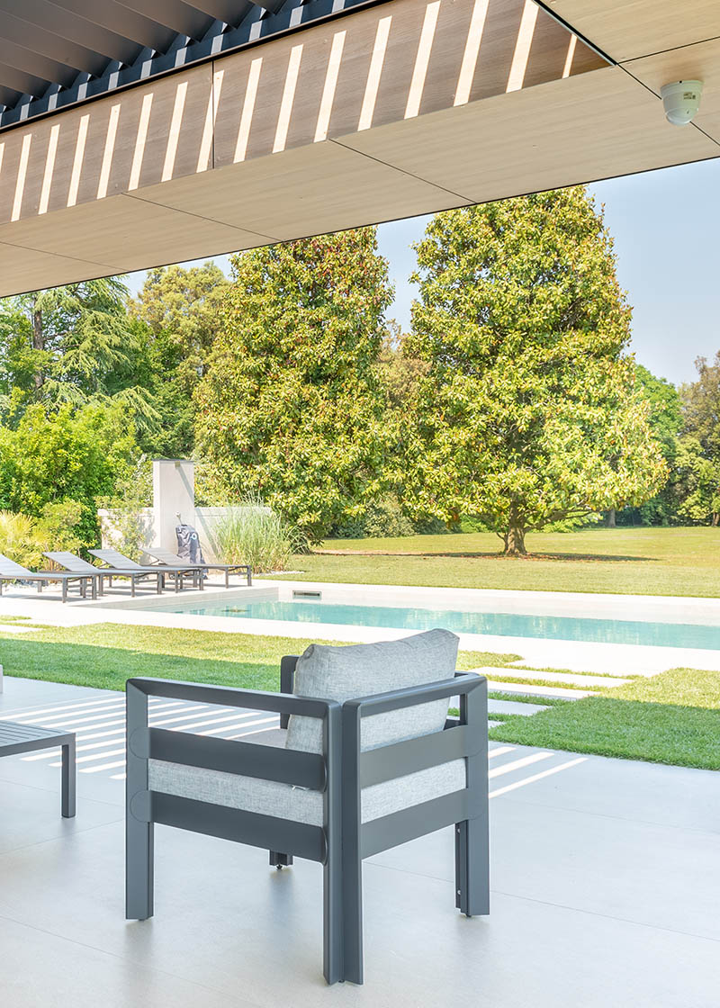 Pour les sols intérieurs et extérieurs de la maison, de grandes dalles ultra-minces de la collection Nextone ont été choisies. Déclinée en plusieurs formats et trois épaisseurs différentes, cette collection transpose aussi bien à l’intérieur qu’à l’extérieur l’équilibre esthétique et naturel de la pierre, assurant une continuité visuelle impeccable entre le jardin et les espaces intérieurs. La teinte Next Taupe, un gris chaud aux notes brunes, confère aux surfaces une chaleur enveloppante et une matérialité élégante. Pour la salle de bains, la collection Noblesse a été utilisée, une sélection de marbres céramiques inspirés des essences naturelles les plus nobles, avec des couleurs vibrantes et innovantes ainsi que des nuances classiques réinterprétées. Le projet met en valeur Gray Marble, un marbre à la texture raffinée et complexe, parsemé d’inclusions minérales allant de l’ivoire au bronze, qui habille de beauté murs, baignoire, douche et lavabo. Un projet qui redessine les espaces pour offrir non seulement du confort, mais aussi une connexion profonde avec la nature.