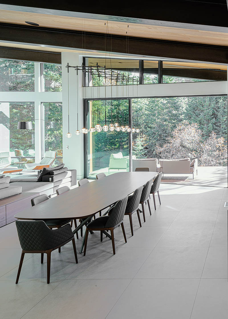 La décoration de l’intérieur est conçue comme une continuation harmonieuse de ce qui est à l’extérieur de la maison. Les teintes grises et beiges des roches sur lesquelles l’habitation se dresse servent d’inspiration aux tissus des fauteuils et des canapés. Quant aux matériaux, ils ont été sélectionnés de façon à équilibrer la lumière naturelle qui envahit l’intérieur, mettant en valeur les murs et les sols. Pour ces derniers, c’est la collection Nextone de Lea Ceramiche (90x90 cm et 9 mm d’épaisseur) qui a été utilisée, avec la finition Next White pour exprimer « la fraîcheur chaude » de la pierre en agrandissant l’espace environnant. En outre, les revêtements de sol qui mettent à l’honneur Lea Ceramiche, associés aux meubles artisanaux italiens pour tous les espaces, donnent aux intérieurs une touche d’élégance et de style contemporain.