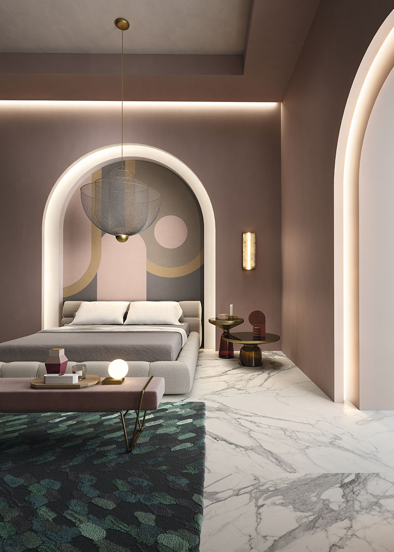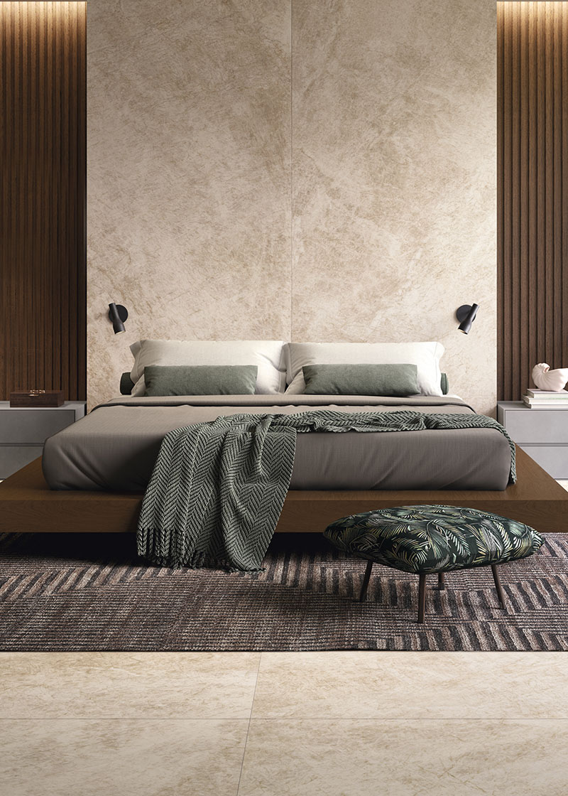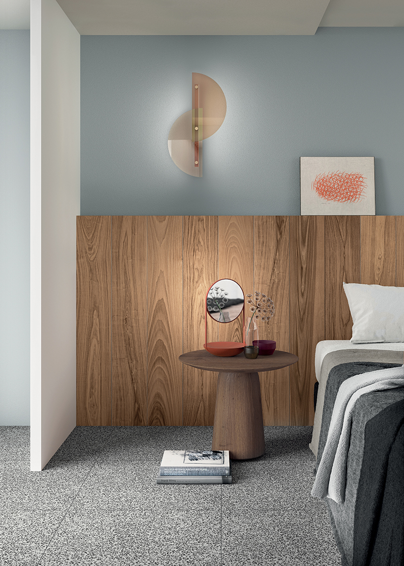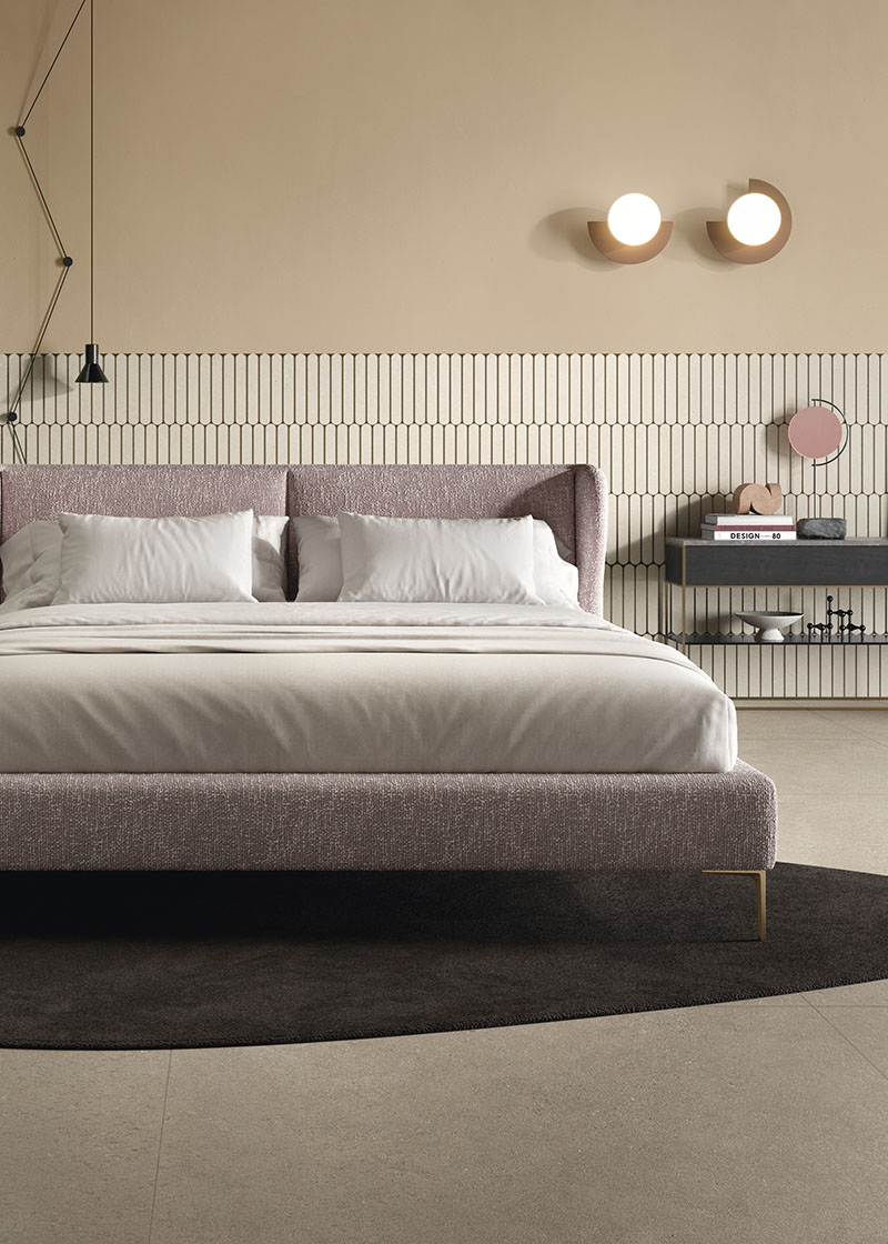 Lea Ceramiche propose plusieurs collections pour habiller la chambre à coucher. Des surfaces aux décors et aux textures assorties qui se ressemblent et s’assemblent, à intégrer à des couleurs et des jeux de lumière sinueux et élégants. Les surfaces Lea Ceramiche sont également équipées de la technologie Protect® qui intègre de manière permanente au cours du processus de production des ions d’argent dans le carreau, pour offrir une protection continue et efficace tout au long du cycle de vie du produit, de jour comme de nuit.