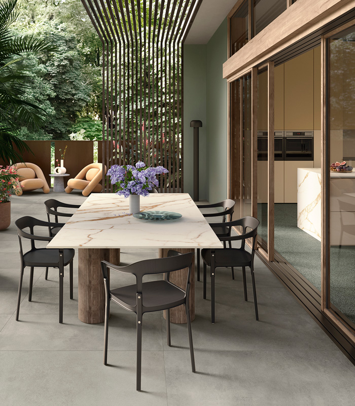 Des solutions structurelles pour les sols extérieurs jusqu’aux grandes dalles ultra-minces Slimtech, la céramique dépasse la simple fonction de revêtement pour devenir un véritable élément de projet : plateaux de tables outdoor à l’allure sophistiquée ou assises parfaitement intégrées dans le paysage.