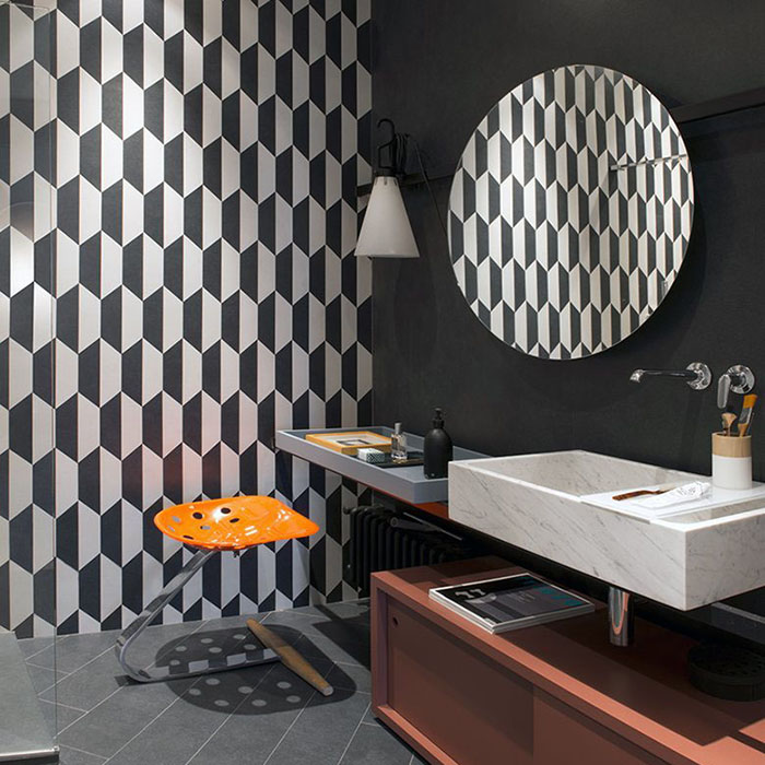« Je considère que la salle de bains est un lieu dynamique, polyvalent qui offre de grandes possibilités de personnalisation, […]Dans ma salle de bains, le dynamisme s’exprime à travers un système qui offre la possibilité de déplacer des accessoires et des lampes sur une structure métallique tandis que le carrelage graphique bicolore habille le mur du fond de la pièce et devient un élément de personnalisation puissant. »