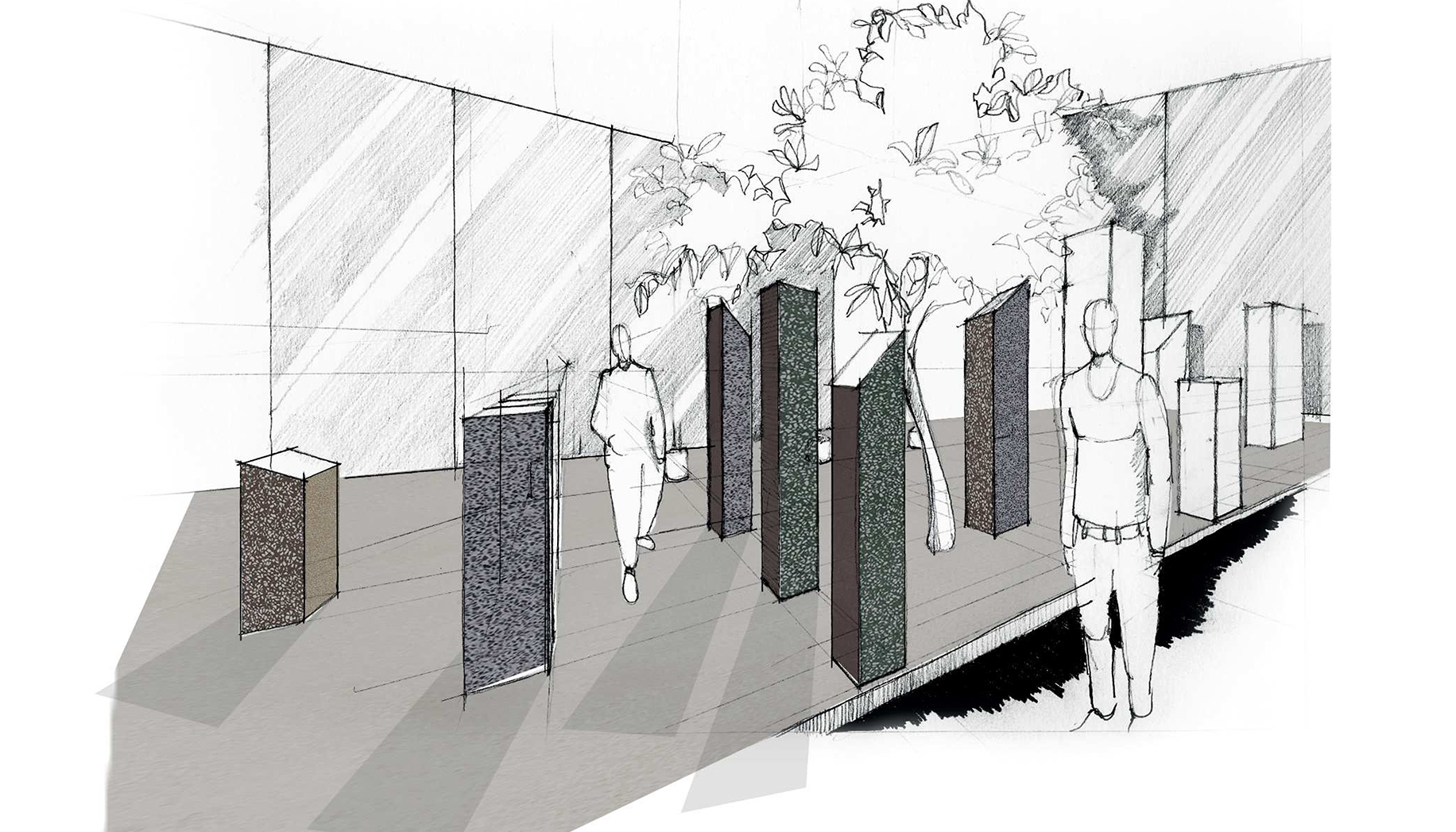 Bien que ce projet puisse sembler simple, le décrire ne l’est pas tout autant. Il s’agit d’un espace public occupé par une installation que l’on pourrait définir comme lieu contemplatif où il vous est possible de réserver quelques minutes de votre temps à la pensée, à la réflexion et au reflet de votre personne, au sein d’un paysage métaphysique, d’un petit bois architectural, d’un panorama infini…