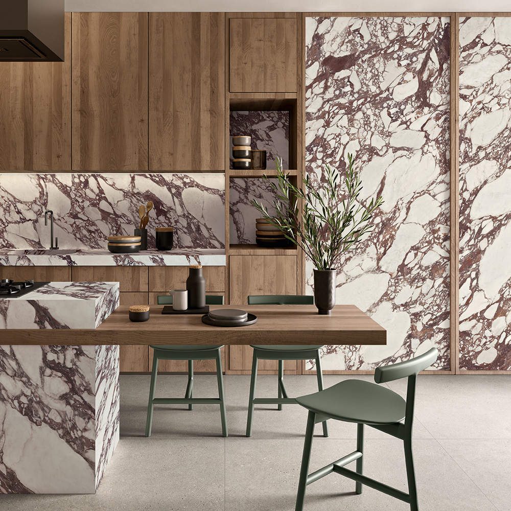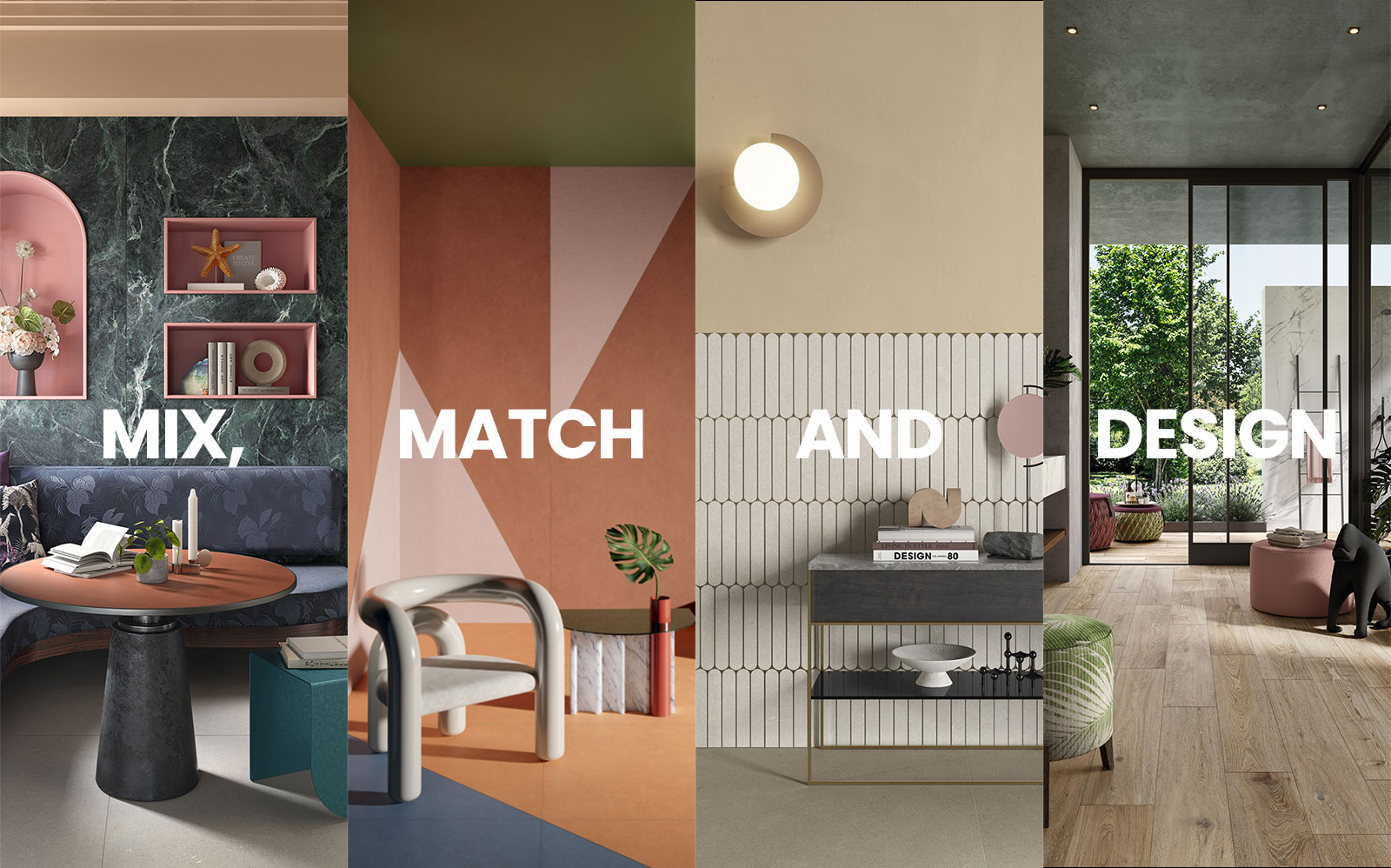 Chaque collection est l’interprétation d’une esthétique différente, qui trouve toutefois toujours un point de rencontre avec les autres : béton et marbre, pierre et bois, couleurs saturées et tons neutres sophistiqués.