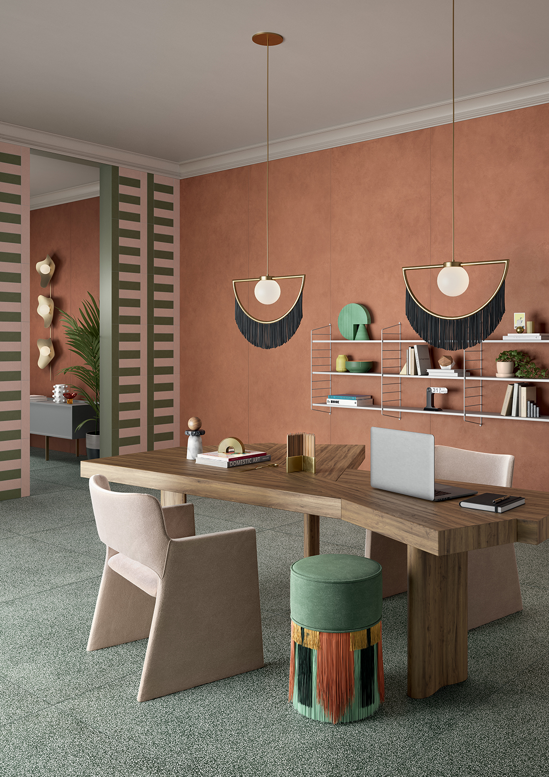Master, inspirée au ciment et Piece, inspirée au « Seminato », qui peuvent être librement combinées entre elles ou vivre séparément. Des évocations aussi fertiles et plastiques libèrent la créativité des architectes et des architectes d'intérieur, confrontés à un jeu de combinaisons particulièrement stimulant.