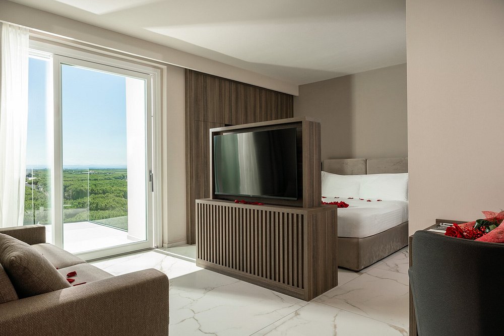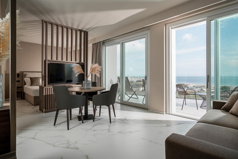 Des lignes fluides, des balcons courbes et de grandes surfaces vitrées dessinent une architecture de pleins et de vides, où matière et transparence se rencontrent dans un équilibre raffiné. Le bâtiment, articulé sur neuf étages, accueille 37 chambres et quatre suites, et culmine dans un spa panoramique ouvert à 360° sur l’horizon, où la lumière devient matière et construit des espaces d’équilibre, de bien-être et de silence.