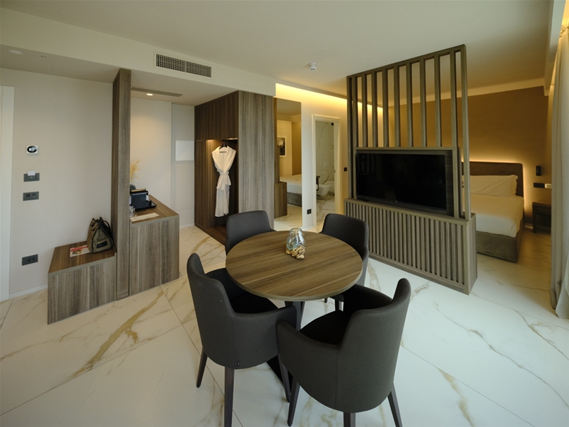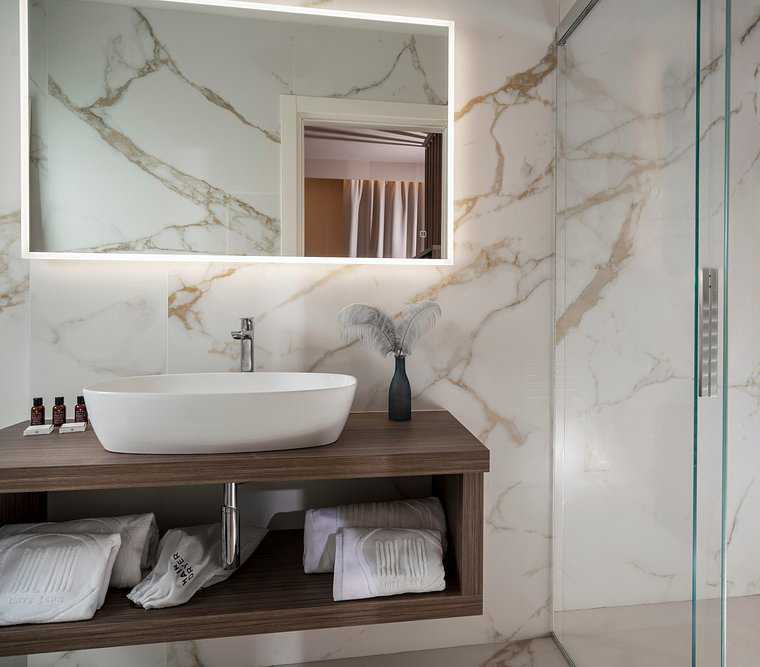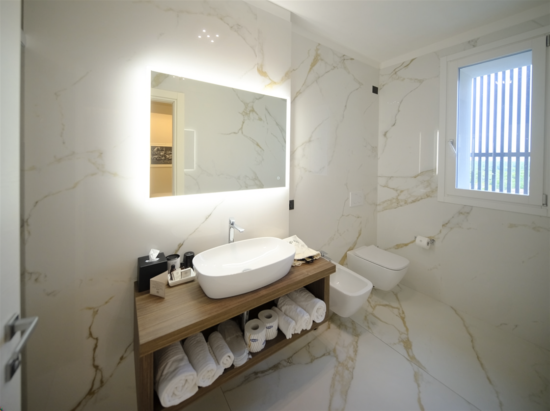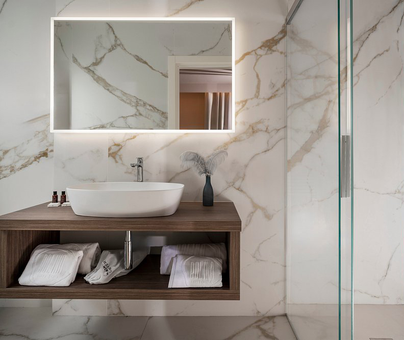Les surfaces Lea Ceramiche définissent le caractère matériel et sensoriel du projet, accompagnant chaque espace avec des textures et des finitions choisies pour exprimer élégance, cohérence et confort. À l’intérieur, les suites et les salles de bains sont caractérisées par la collection Noblesse – Calacatta Oro, utilisée en version naturelle pour les sols et en version polie pour les revêtements muraux : un marbre céramique lumineux et sophistiqué qui amplifie la perception de l’espace et la qualité de la lumière.