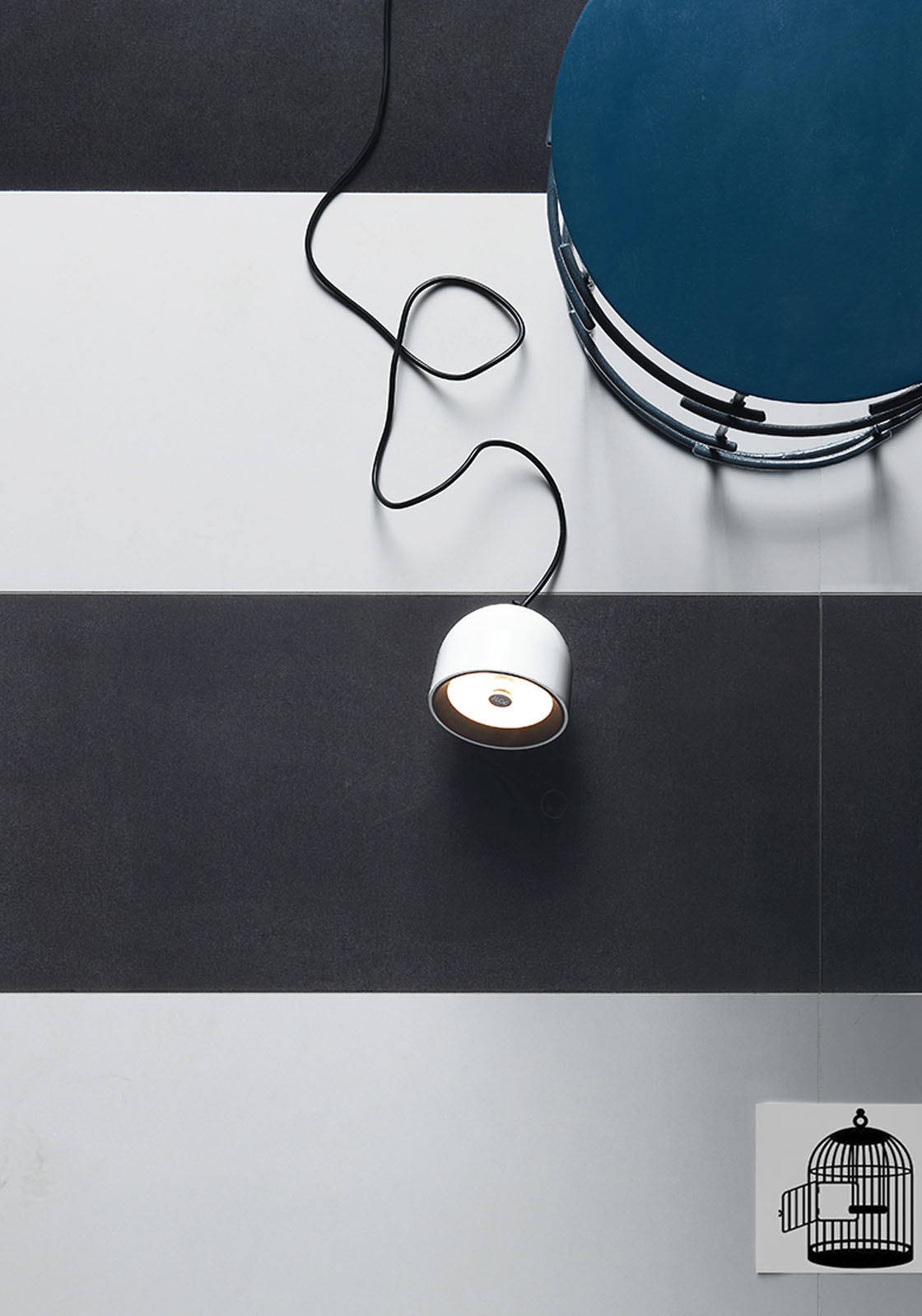 Au sol, l’alternance du noir et du blanc des dalles Absolute Slimtech amplifie l’espace et le rend lumineux et spacieux, grâce à la finition brillante du grès laminé, dernière évolution de la technique, hier encore, inconcevable sur des épaisseurs aussi réduites.